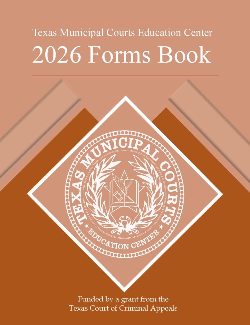 The Forms Book is intended to serve as only a guide and to provide accurate and current information. However, it is published with the intention that TMCEC is not engaged in rendering legal or other professional advice. All users must be responsible for their own legal drafting. Legal drafting should be accompanied by legal advice and direction from the city attorney. TMCEC and its employees do not warrant, either expressly or implicitly, that the forms and information in this volume have not been subject to change, amendment, reversal, or revision.